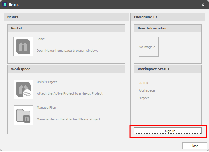 To attach your active Micromine Advance project to a Nexus workspace and project: