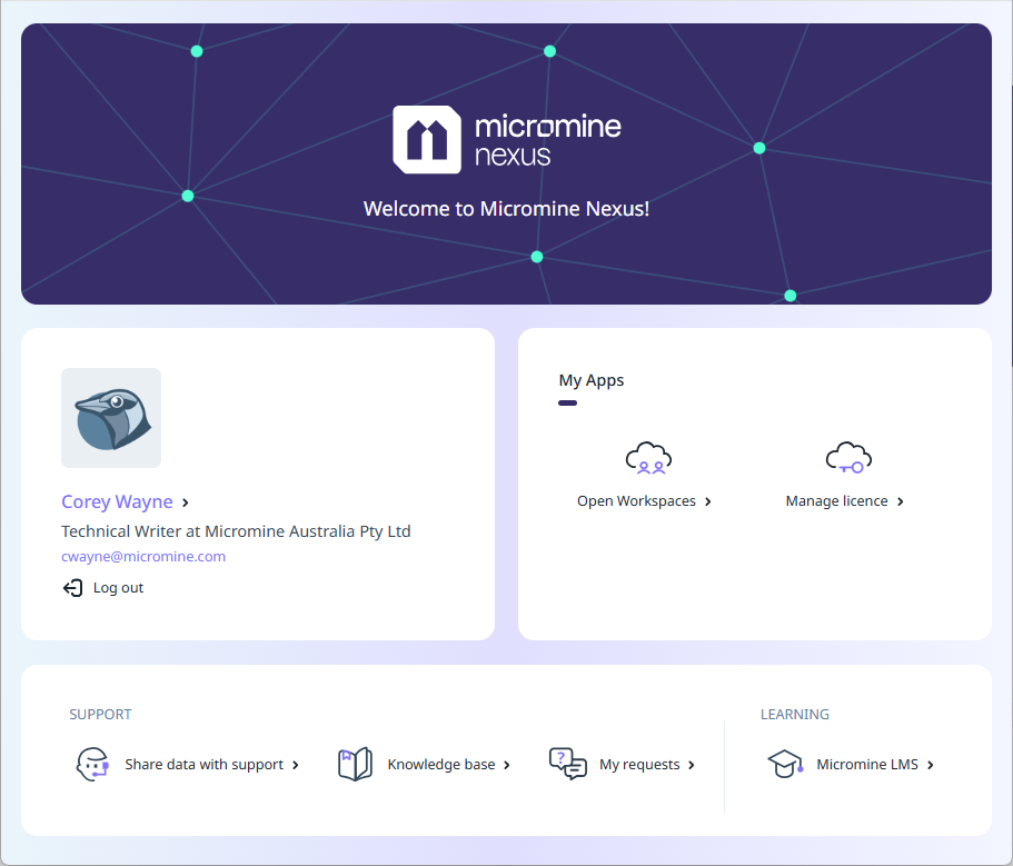 Learning portal - Select the Learning portal to access the Micromine Australia Pty Ltd Learning Management System, which contains a range of self-paced learning programs for licensed users.