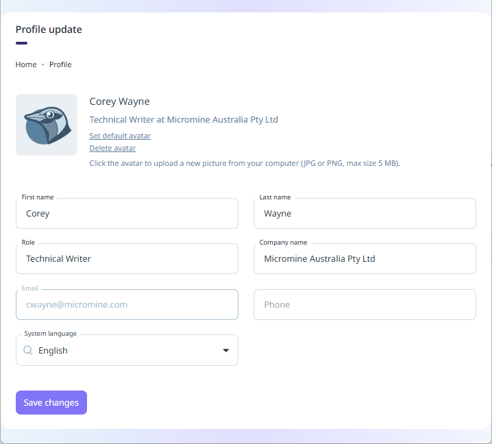 If you click on your Name, the Profile page will open and you can change your details as described above.