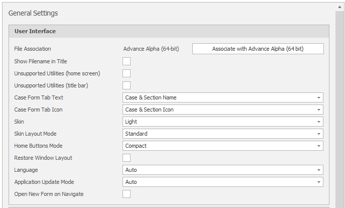 On the General Settings page of the Micromine Advance Settings window, you can now choose between a (Light, Dark) skin and a (Standard, Compact) skin layout. A Light skin and Standard skin layout are the default.