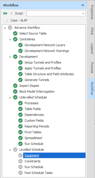 An option to select a scripted workflow has been added to the Workflow dock panel in this release. When there is no script selected, the Advanced Default Workflow (the logical steps that need to be taken to create a schedule) is shown in the Workflow panel.