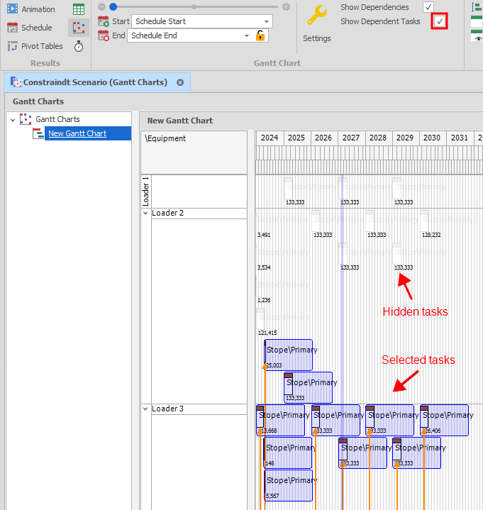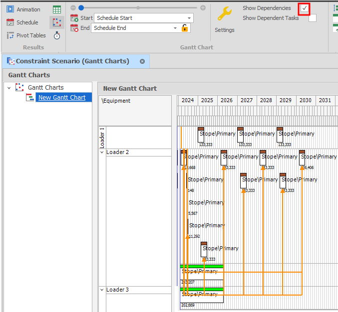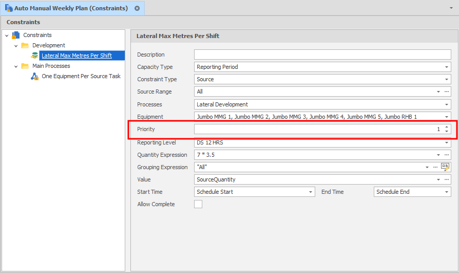 This allows users to specify “safety” constraints (such as not more than 1 equipment per heading, not more than 3 equipment per level), as well as “operational” constraints (such as 100kT per year total, or not more than 10kT on this level in this month) and provides a way of ignoring some or all of the operational constraints, while maintaining all the safety constraints.