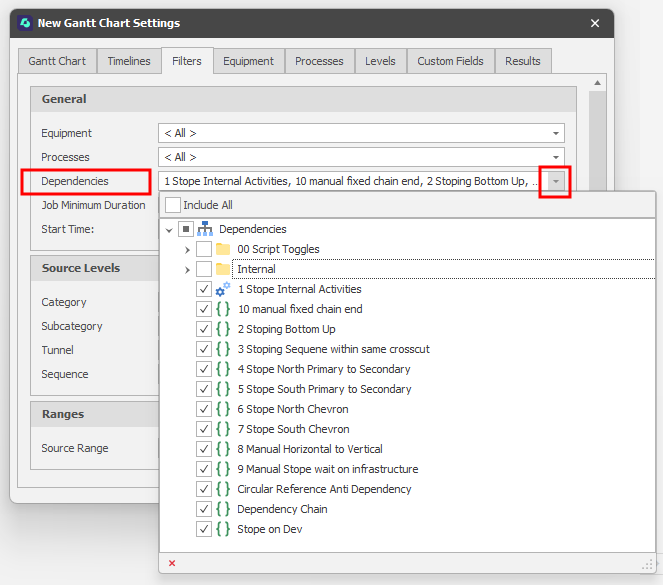 On the Filters tab of the Gantt Settings window, you can now filter by Dependencies. Use the drop-down to select from Dependencies configured for the current scenario: