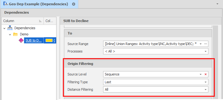 On the Dependencies tab, in the Add group, when you select Geometric Dependency to use a geometric shape to interactively select dependencies from scheduling solids in the Animation Window, you can now set a filter to limit the search by making the origin of the FROM tasks the first/last node of the specified level.