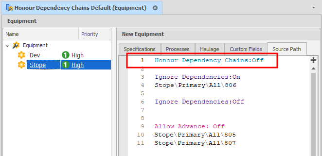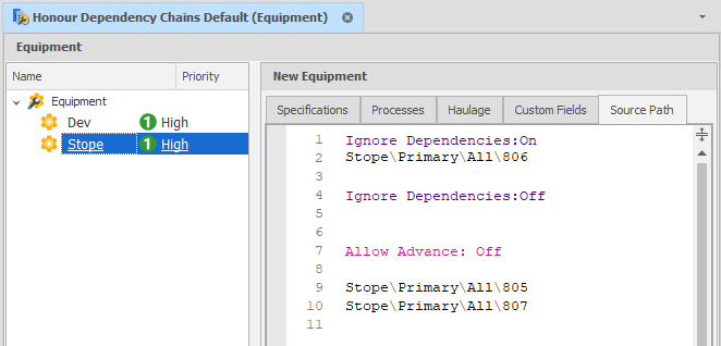 For example, if you have three nodes: Stope\Primary\All\807 → Stope\Primary\All\806→ Stope\Primary\All\805 and you ignore dependencies and complete task 806, the default behaviour will ensure 805 waits on 807 until it is done.