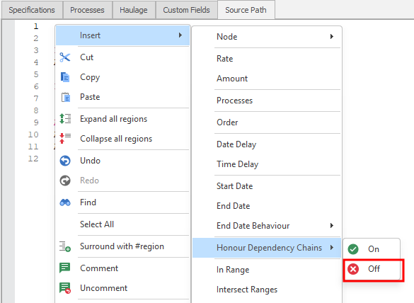 The Source Path syntax has been extended to include an Honour Dependency Chains flag which determines whether predecessor tasks are honoured or not when dependencies are ignored. There are two states: