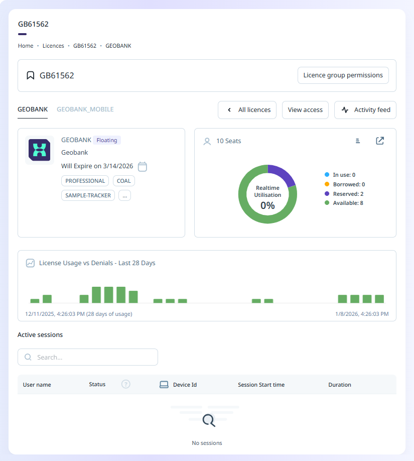 For licence groups (licences which include more than one application, such as Micromine Geobank and Micromine Geobank for Field Teams), the Licence group permissions button is enabled. If you click the button, details of the permissions for the licence group are displayed: