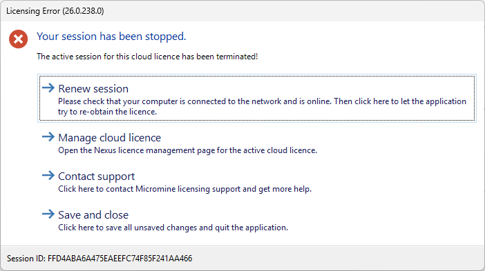 Upon selecting Renew session, the user session is renewed and the status of the licence in the Manage Licence page will return to In Use. If the user selects Terminate, the application for the current session will be shut down and the users session will be evicted and the licence will become available.