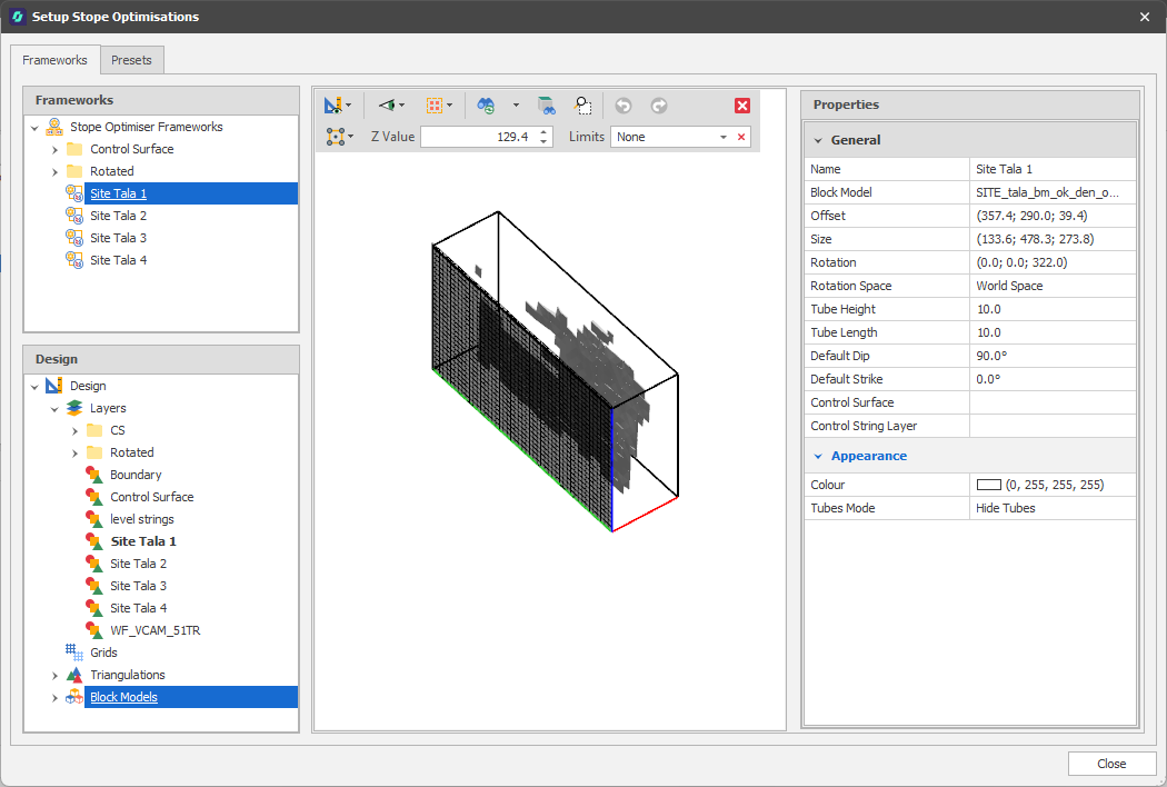 You can create and select multiple frameworks to view the different areas of the ore body you want to run the optimisation on.