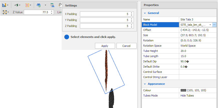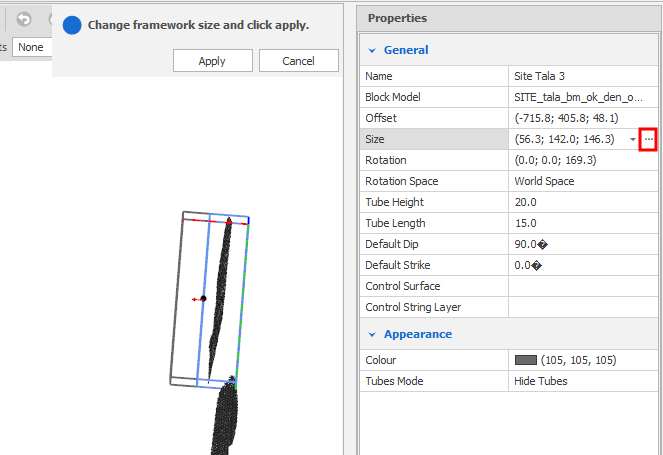 The framework box is positioned over the selected portion of the ore body and a Settings box is shown which allows you to specify X, Y and Z padding values to expand the extents of the framework. This will update the Size and Offsets of the framework in the Properties panel (see below).