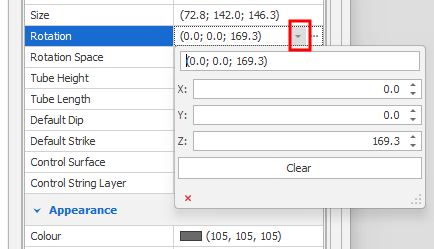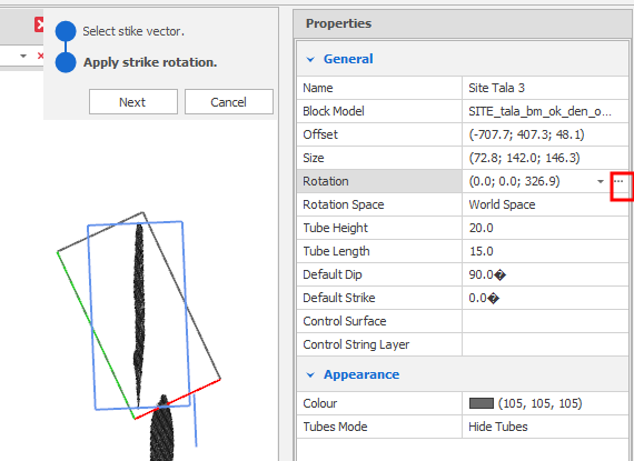 To ensure that the tubes are perpendicular to the orebody, in the Properties panel, click the ellipsis alongside Rotation.