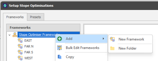 In the Frameworks panel, right-click on the Stope Optimiser Frameworks node and select Add > New Framework.