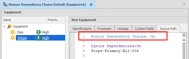 Unless there is a specific process constraint, all tasks that exist in that path range are considered, rather than just what the equipment can work on. For example: Equipment “Jumbo” can only work on Development, not Stope. A path line of “Stope” with include predecessors On should make the Jumbo work on all development tasks that are predecessors of stope tasks.