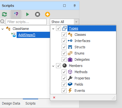 Note that the Scripts panel provides tools that are only applicable to developers, consultants or power users familiar with scripting in C#.