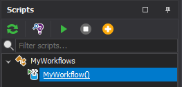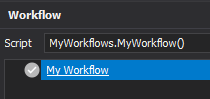 Once we have added the IWorkflow parameter, we can recompile the scripts and we will notice two things. Firstly, the MyWorkflow script is missing from the scripts dock panel, and secondly, the MyWorkflow script will be added to the Script Select of the Workflows dock panel.