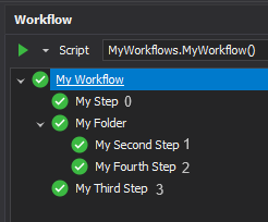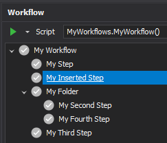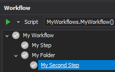 Adding the above code will add a folder to the workflow tree called My Folder with a leaf node called My Second Step.