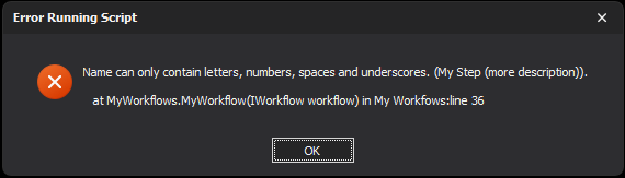 Sometimes it is desire to have a more descriptive name for a workflow step than is allowed by the normal workflow naming rules. For example, you really want brackets in the name of your workflow step. If you were to try to add a name with brackets or other special characters, like the following example: