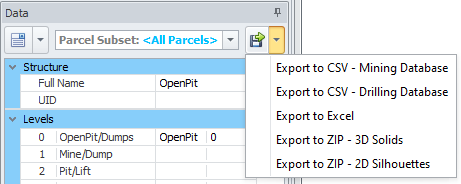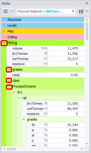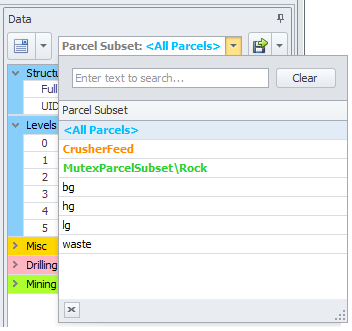 Click to select the parcel subsets to display data on. Subsets variables can make rules and reporting easier, by referring to groups such as "Ore Materials", "Contractor Pits", or "Stockpiles on ROM1".