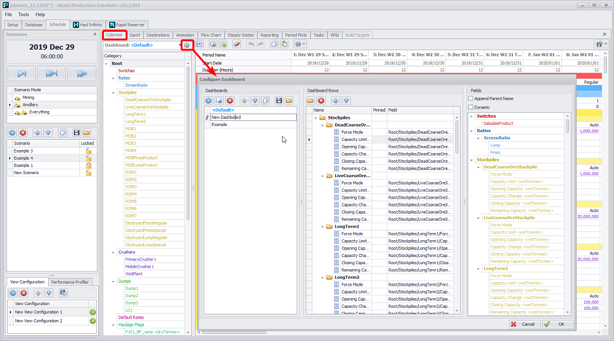 Go to Schedule > Calendar > Dashboard field > gear icon > Configure Dashboard dialog.