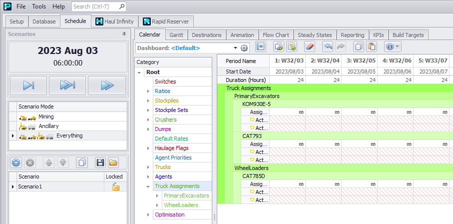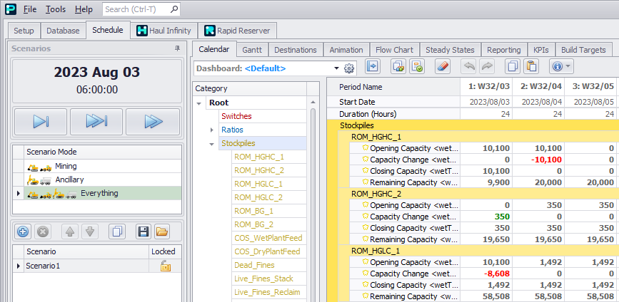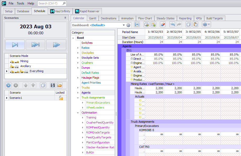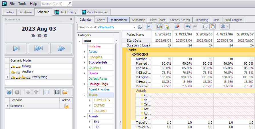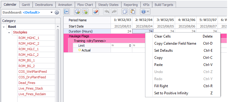 Dashboards allow a user to create custom Calendar layouts. This can be used to organise rows into a concise summary of equipment used, tonnes moved, and grades achieved. For more details, see Calendar Dashboards.