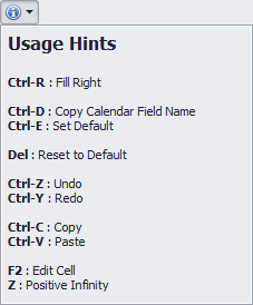 Set Defaults | Sets a default values for cells. This value will be used when updating Calendar periods. (Ctrl-E) |