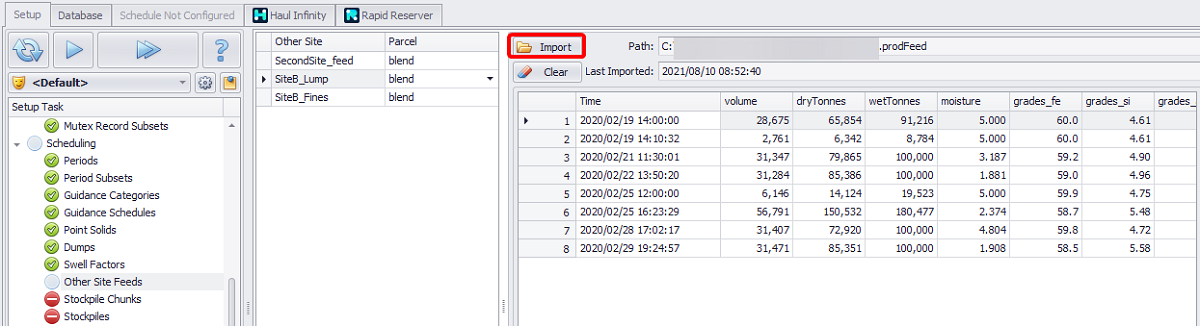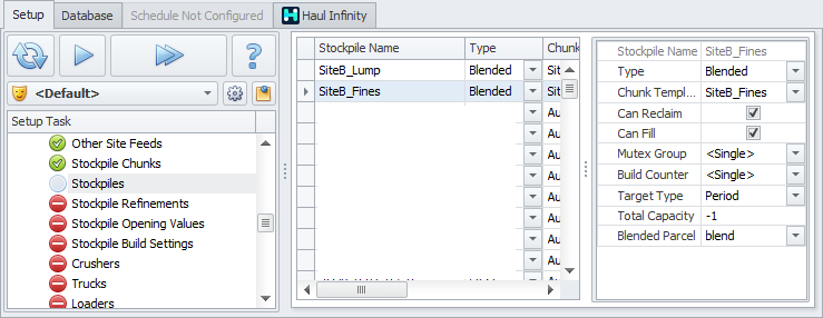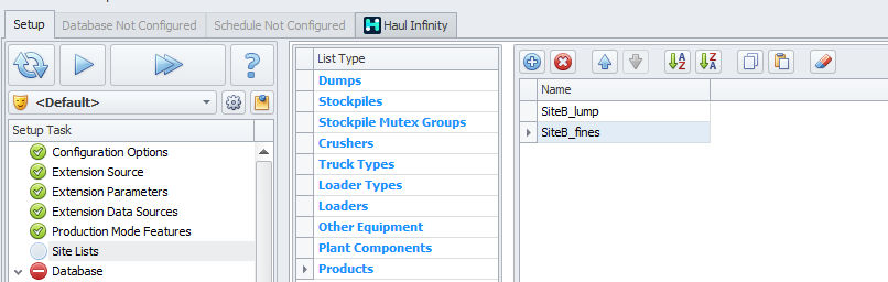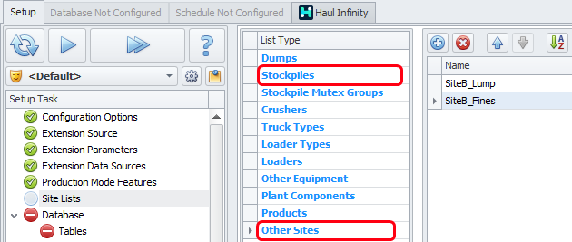 Add “SiteB”_lump” and “SiteB_fines” in the Site lists for Stockpiles and Other Sites
