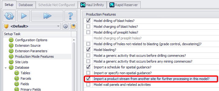 > Production Mode Features step > flag Import a product stream from another site for further processing in this model option.