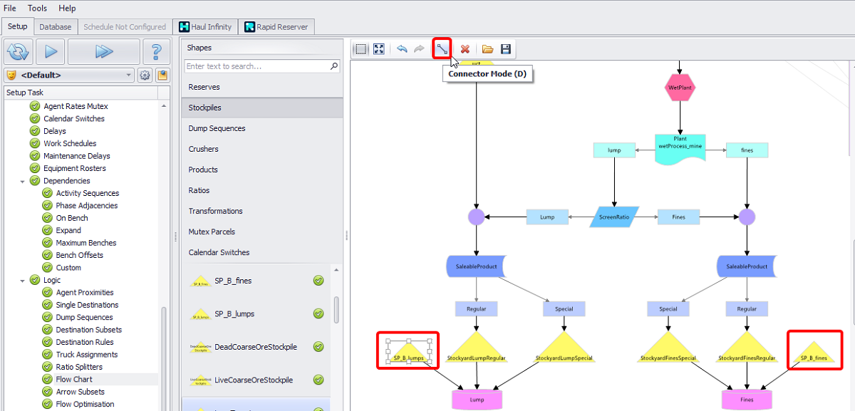 Add newly created stockpiles to the chart and connect them to the next process flow item