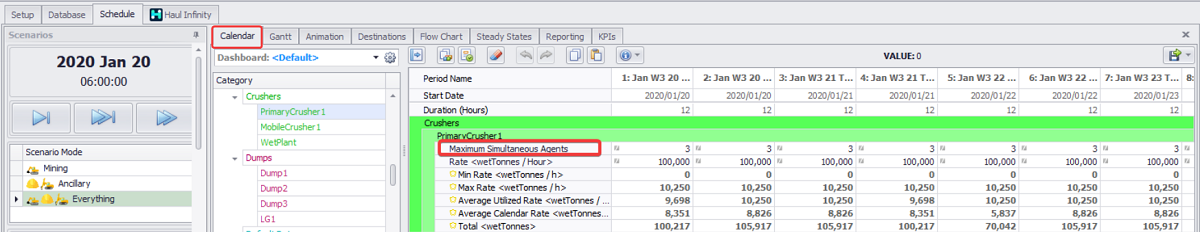 It is possible to limit the number of Agents sending material to the Crushers at the same time. When ticked, a new row will appear on the Calendar for Crushers, allowing users to specify the maximum number of simultaneous Agents.
