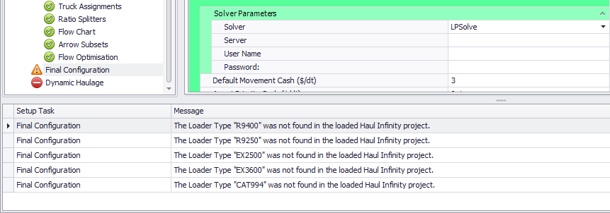 “The following material types are missing from Haul Infinity Project (Unassigned)”.
