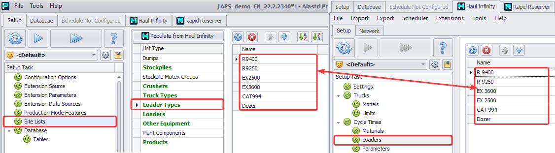 Check for mismatches between: APS > Setup > Site Lists > Loader Types and Haul Infinity > Cycle Times > Loaders.