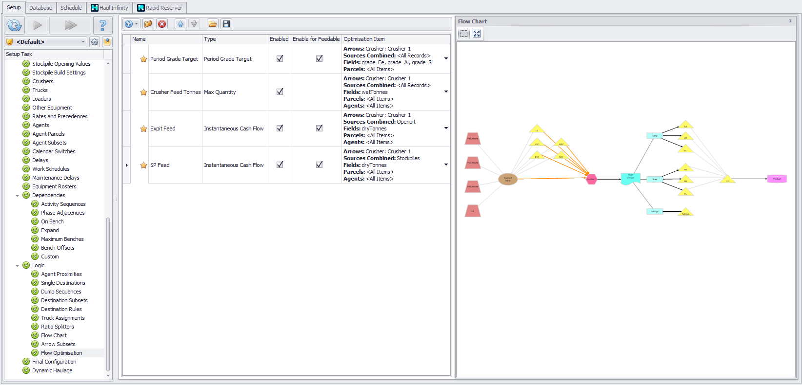 Optimisation rules set in the Flow Optimisation step tell the software user’s display preferences (grades, blends, tonnes) when calculating destinations and product handling.