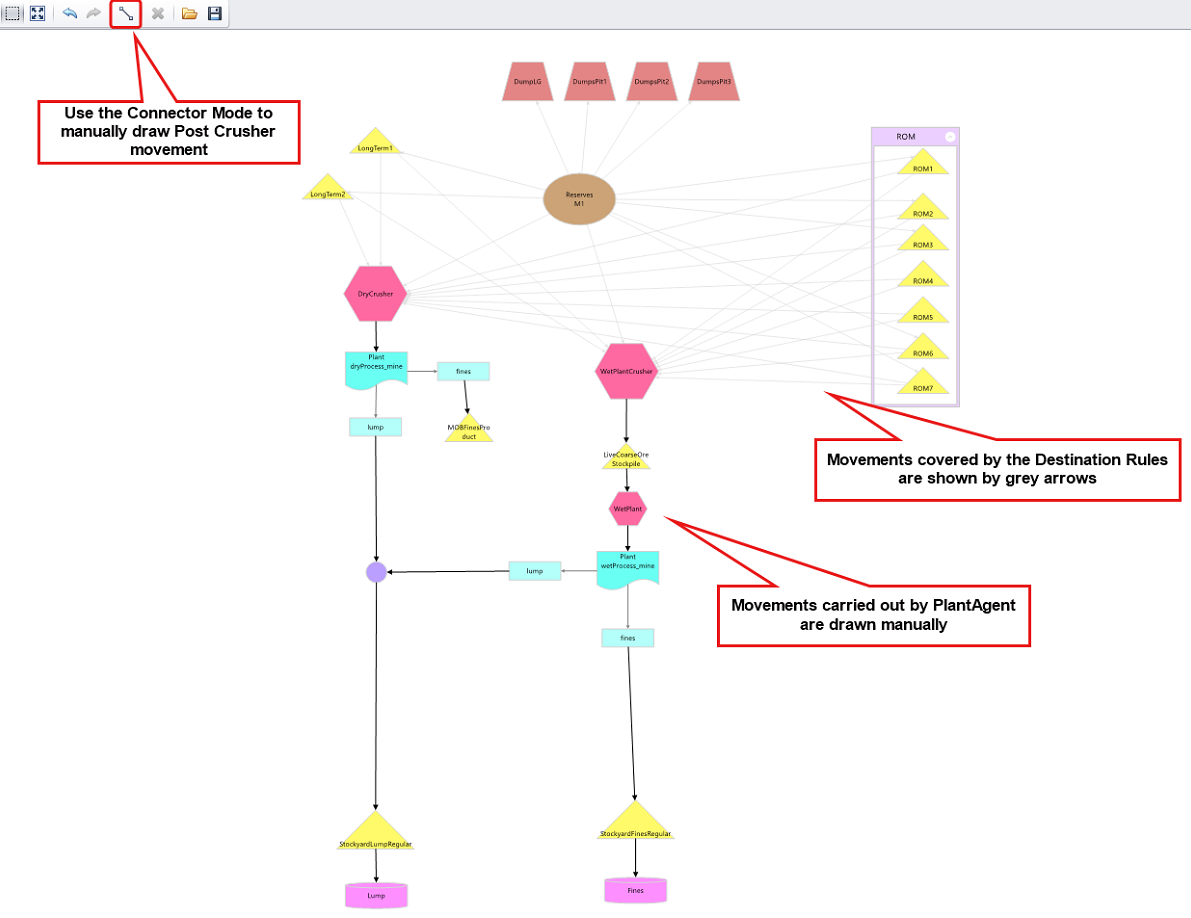 The Plant Agent controls Post Crusher movements, that are not covered by Destination rules, but drawn manually in the Flow Chart step.