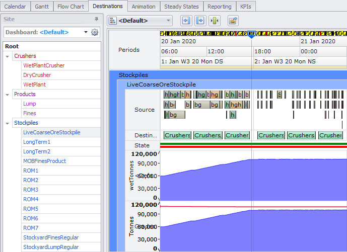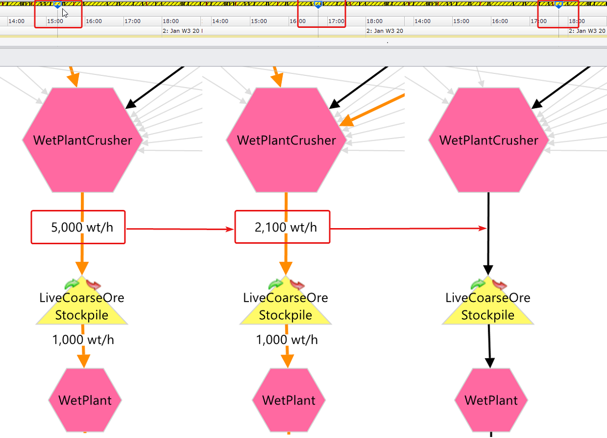 In the example below, when reducing the PlantAgent’s max rate to 1000wt/h vs 5000wt/h Crusher’s rate, it creates bottleneck at the Crusher downstream since the Stockpile is getting filled faster than can be reclaimed to feed the Crusher:
