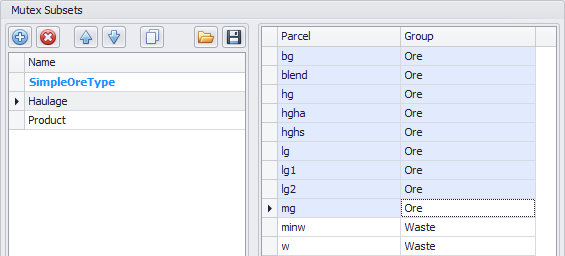 Grouping up parcels (into ore and waste, for example) allows the user to reference these names later in the Setup. This makes it easy to manage any changes to material type names, or to include new material types into the existing “ore” and “waste” groups.