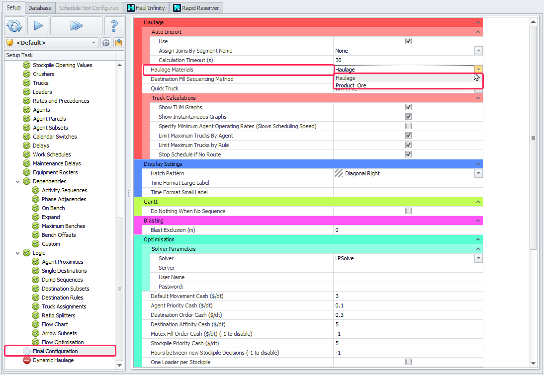 In Final Configuration step select Haulage Material group defined in Parcels Subsets step
