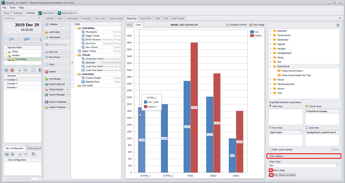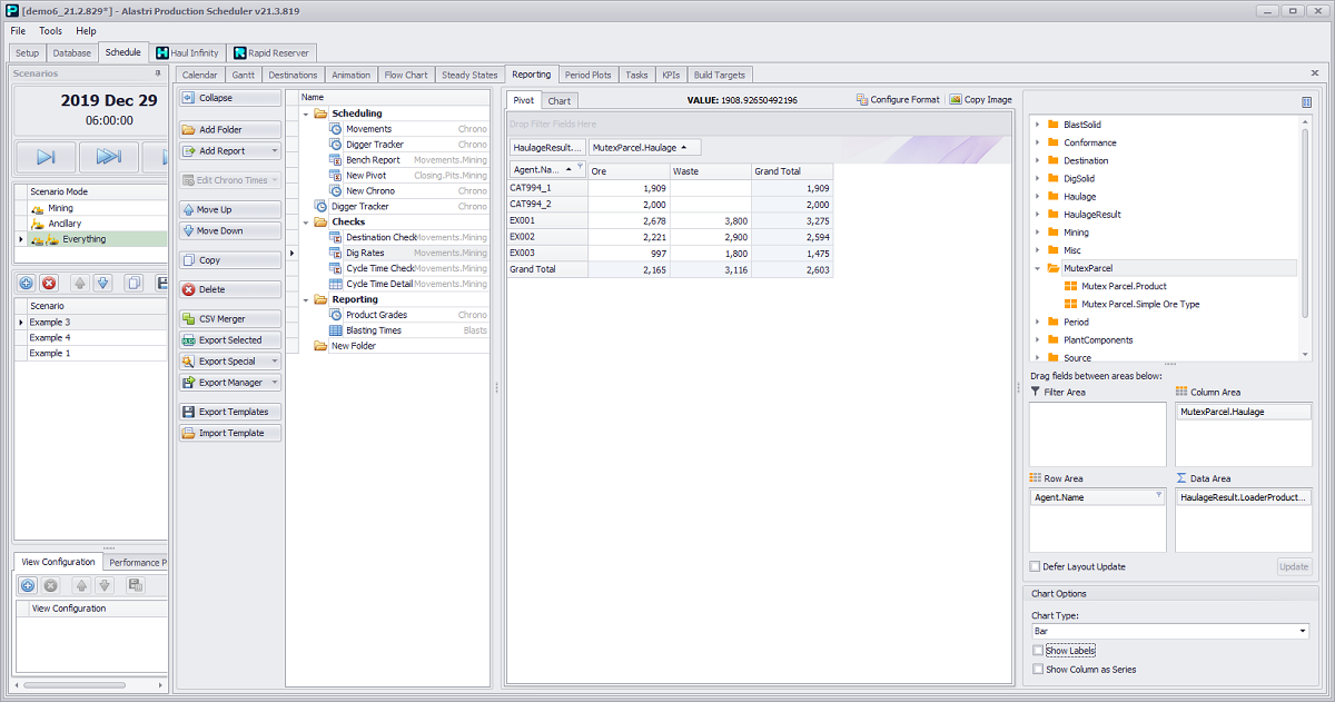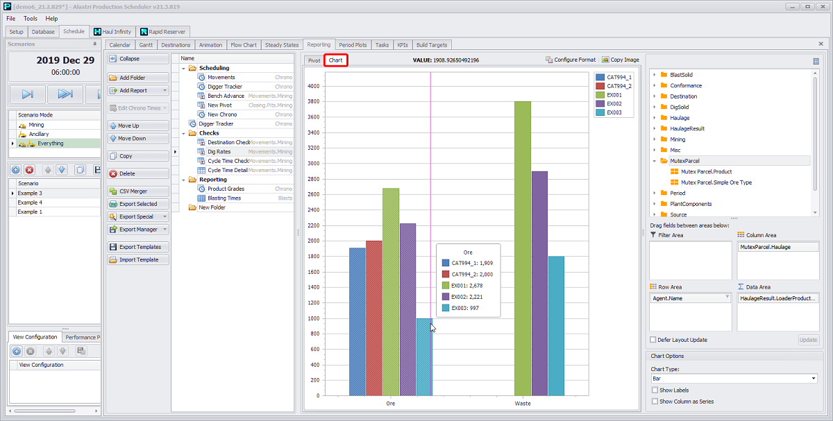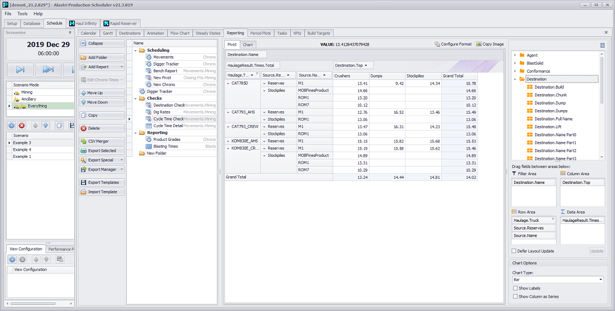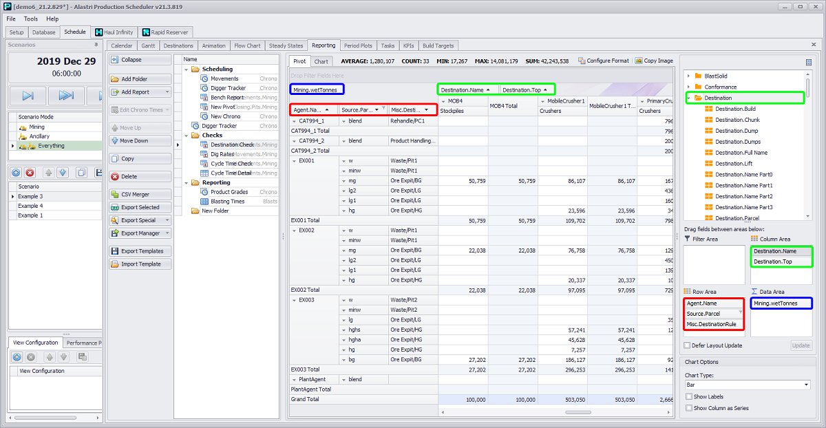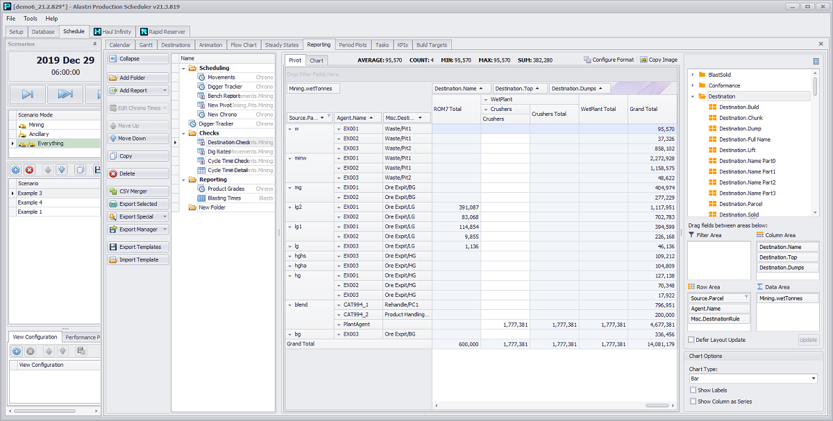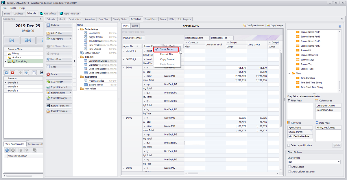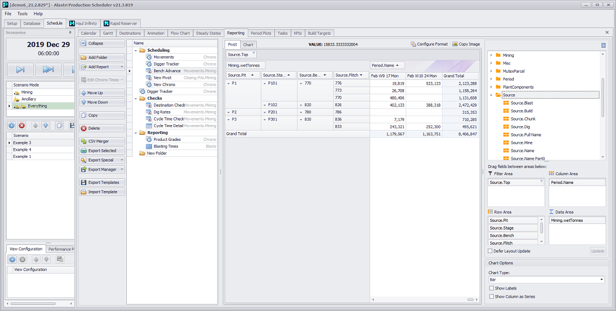 Schedule tab > Reporting tab > Add Report button dropdown > Movements option > Mining activity > “Pivot” option