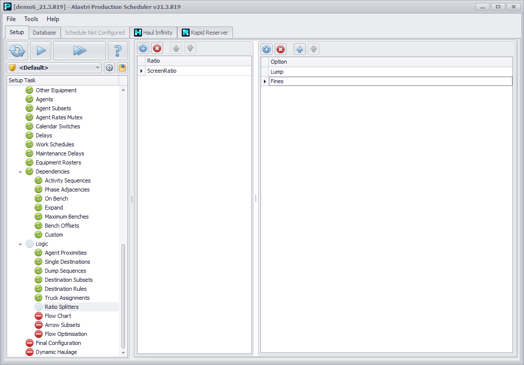 The Ratio Splitters step can be used to model a single stream of material separating into two or more streams. The ratio values are controlled in the Calendar tab on a period-by-period basis and must total to one.