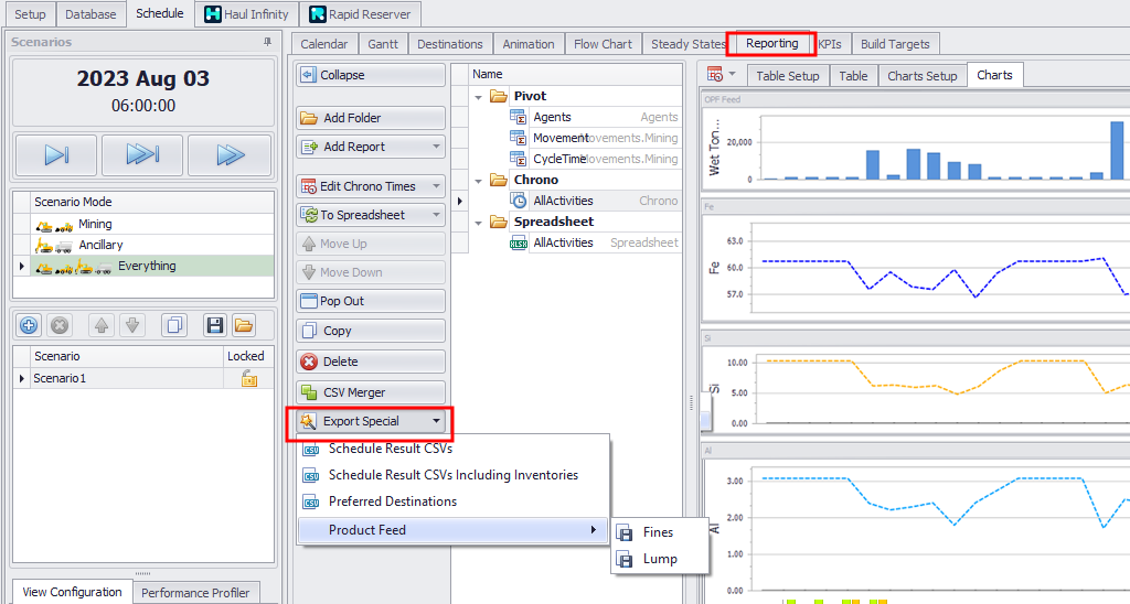 Run the Schedule and select the Reporting tab. Click the Export Special button and select the product stream you want to export. This export will be used in the Central model to simulate an external feed source.