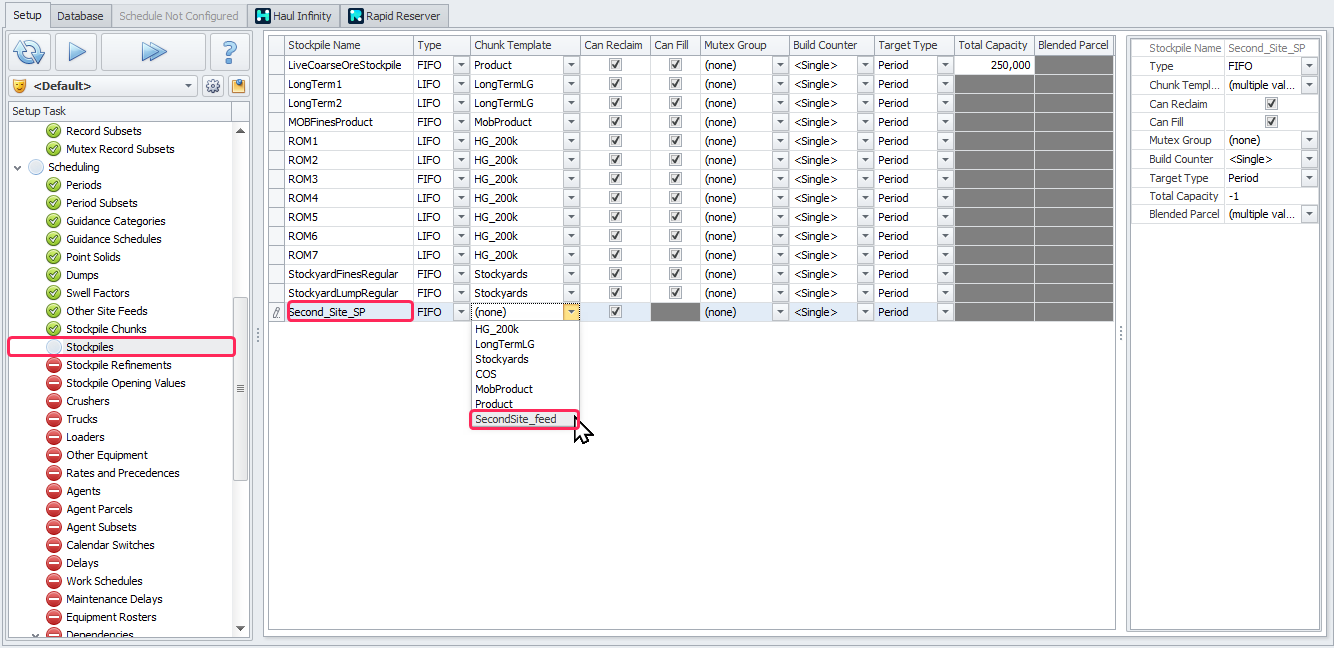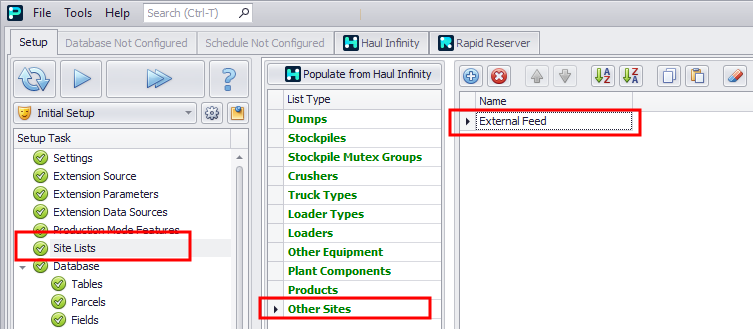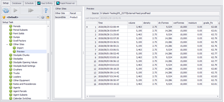 In the Site Lists step, add an external feed source to the Other Sites list. APS will automatically create a temporary stockpile to act as an interim storage facility between the External site and the Central processing plant. Note: This stockpile will need to be created in Haul Infinity.