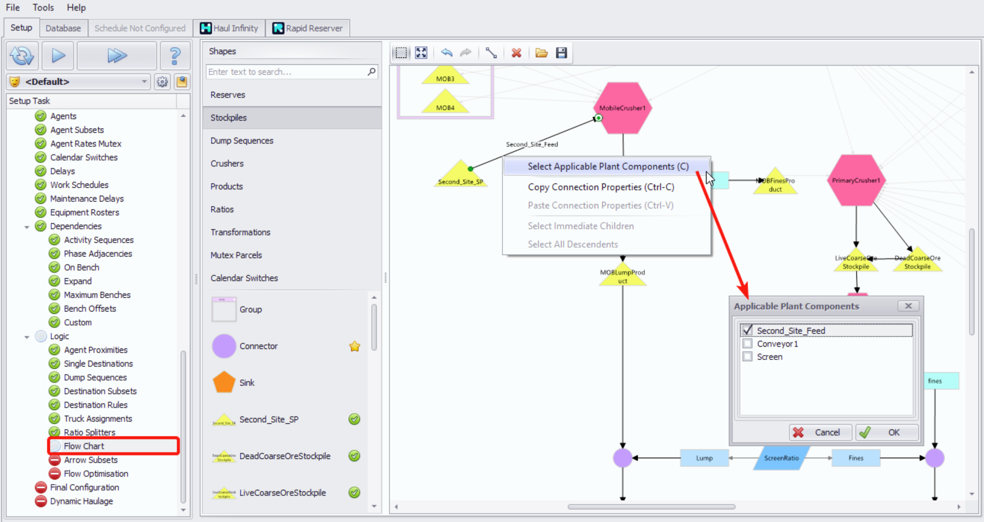 Flow Chart step > Stockpiles > Connector Mode icon > Select Immediate Children > right click > “Select Applicable Plant Components” option > Second_Site_Feed flag
