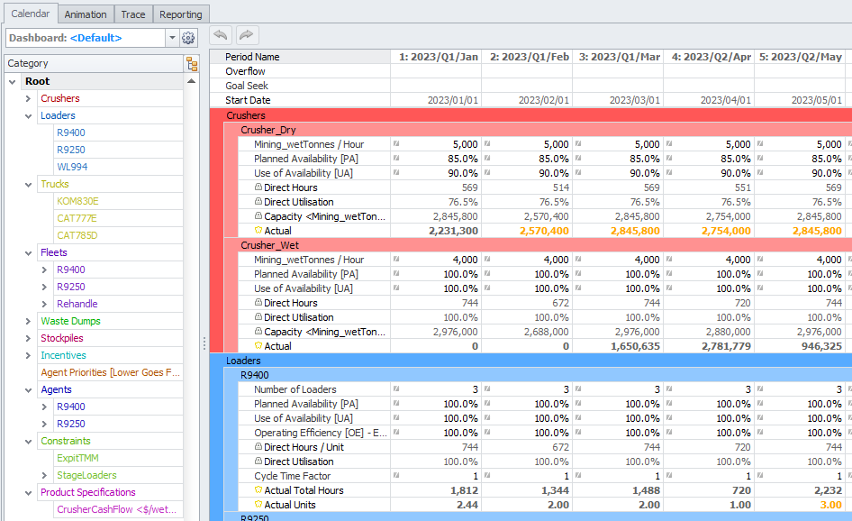 The Calendar tab is a calendar plan for open pit mining, arranged by production periods, mine components, equipment used, and applicable constraints and parameters.