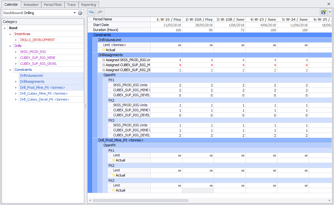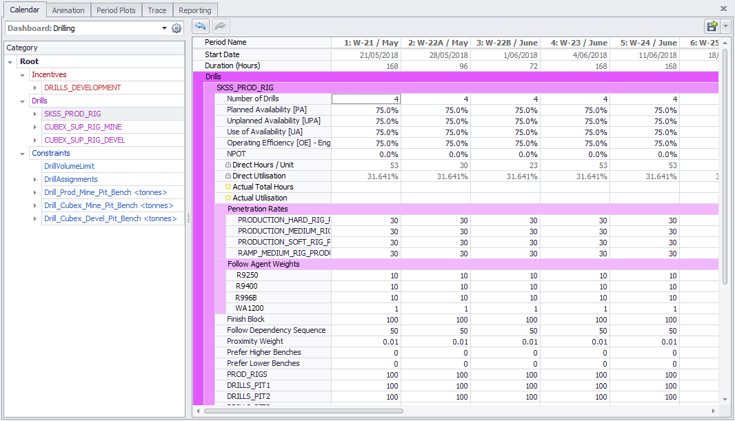 Go to the Animation tab and find the Priority Incentives panel in the top left corner. At the beginning of the schedule, edit the priority incentive for each pit and pre-assign the drill sequence for the entire pit. This way, whenever you assign a drill to this pit in Calendar > Constraints > Drill Assignments, it will pick up the sequence where the last drill left off.