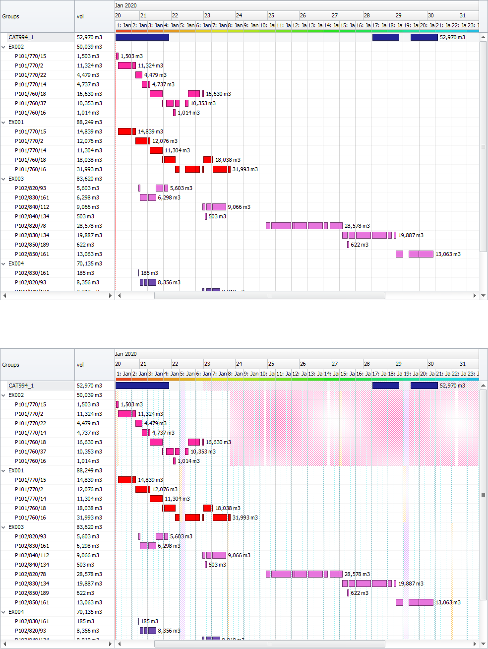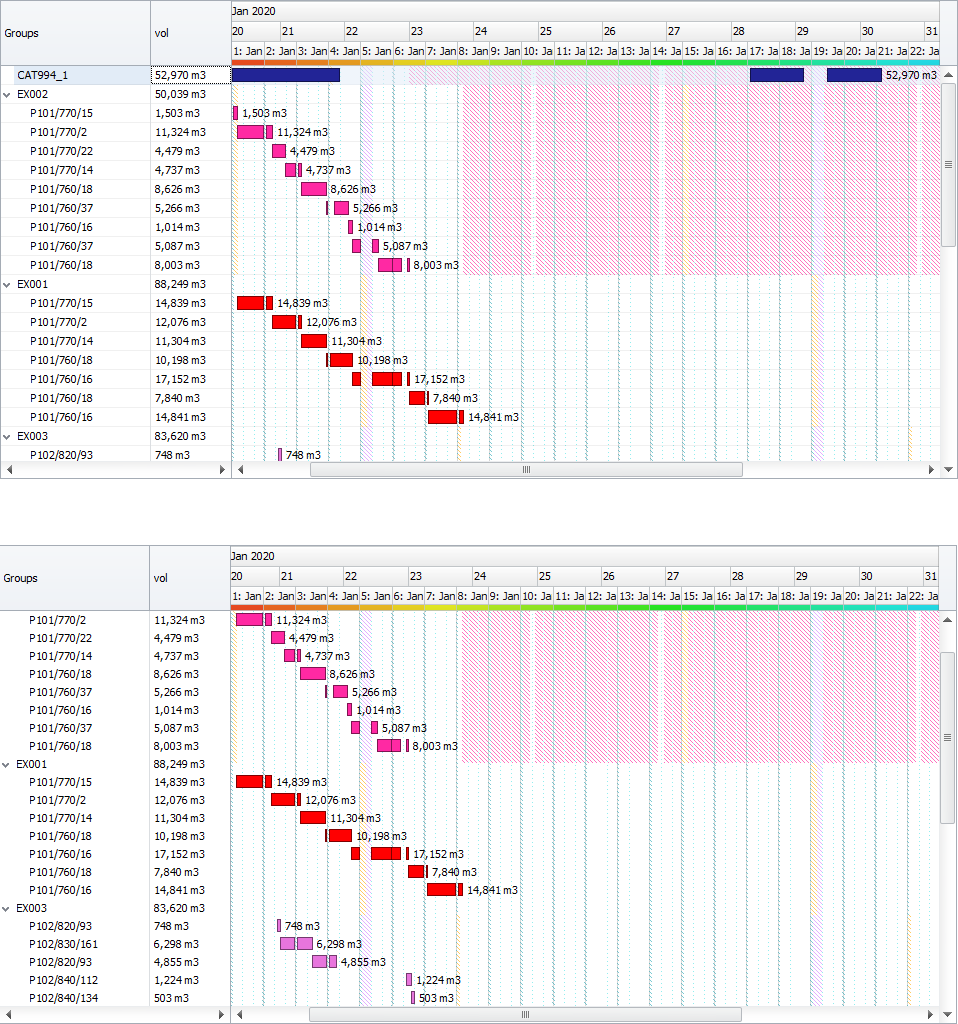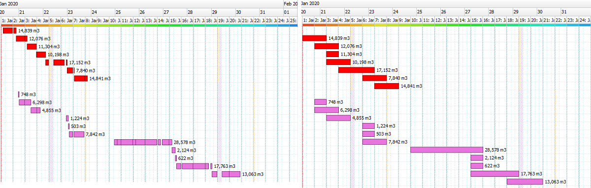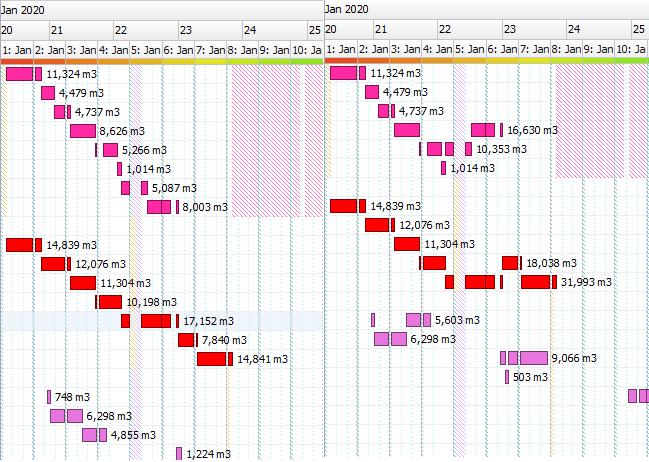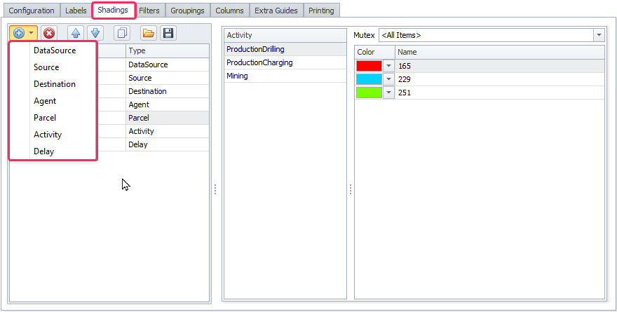 In the Shadings tab, you can add shading options to your Gantt. There are different types of shadings: DataSource, Source, Destination, Agent, Parcel, Activity and Delay.