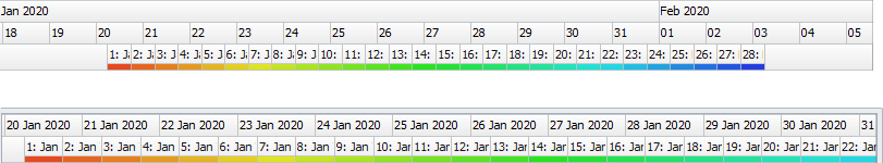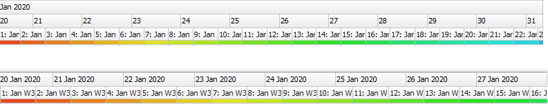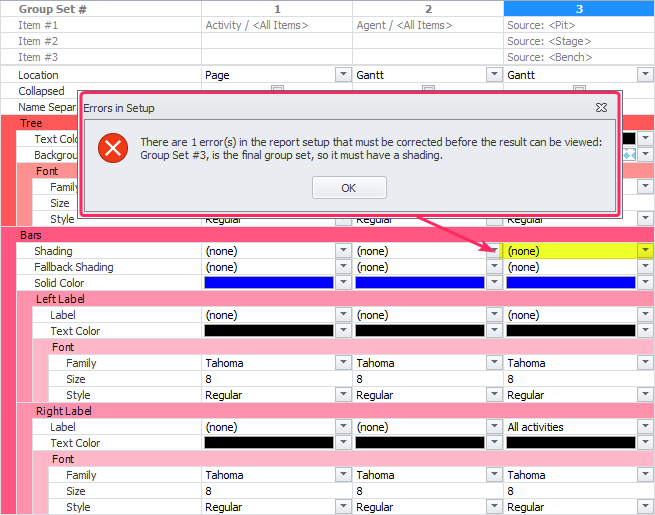 You can choose from one of the Shadings options (created in the Shadings tab). Alternatively you can choose <Continuous/Discrete Solid> and then choose a color for the bar. You can also choose “(none)”, in which case no bar will appear on the row. There are certain types of shadings that can only be shown if at the level the shading is applied has been filtered down to a single activity either through the selections at a level above or through the Filters tab.