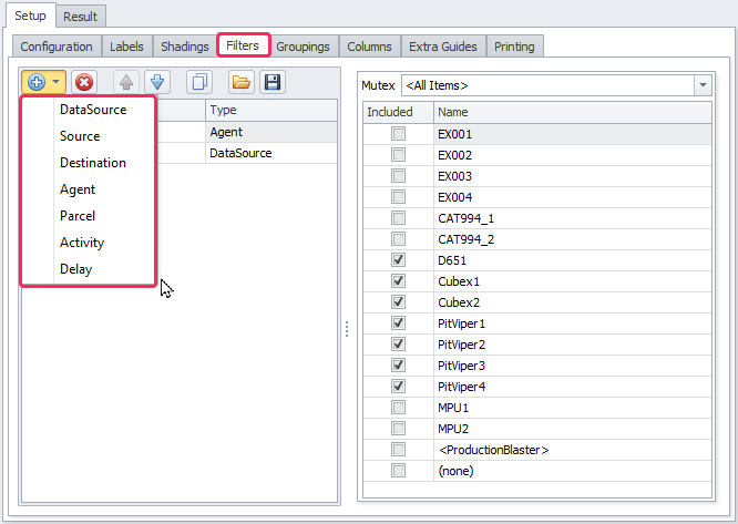In the Filters tab, you can add filters to your Gantt. There are different types of filters: DataSource, Source, Destination, Agent, Parcel, Activity and Delay.
