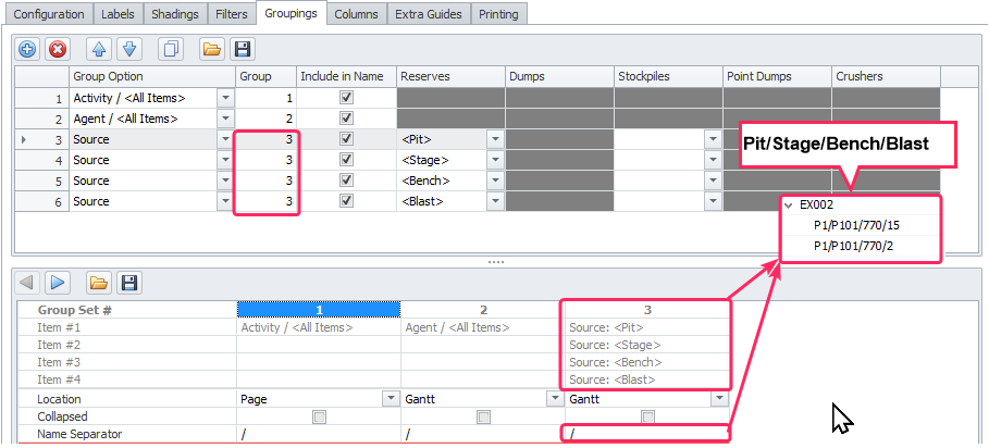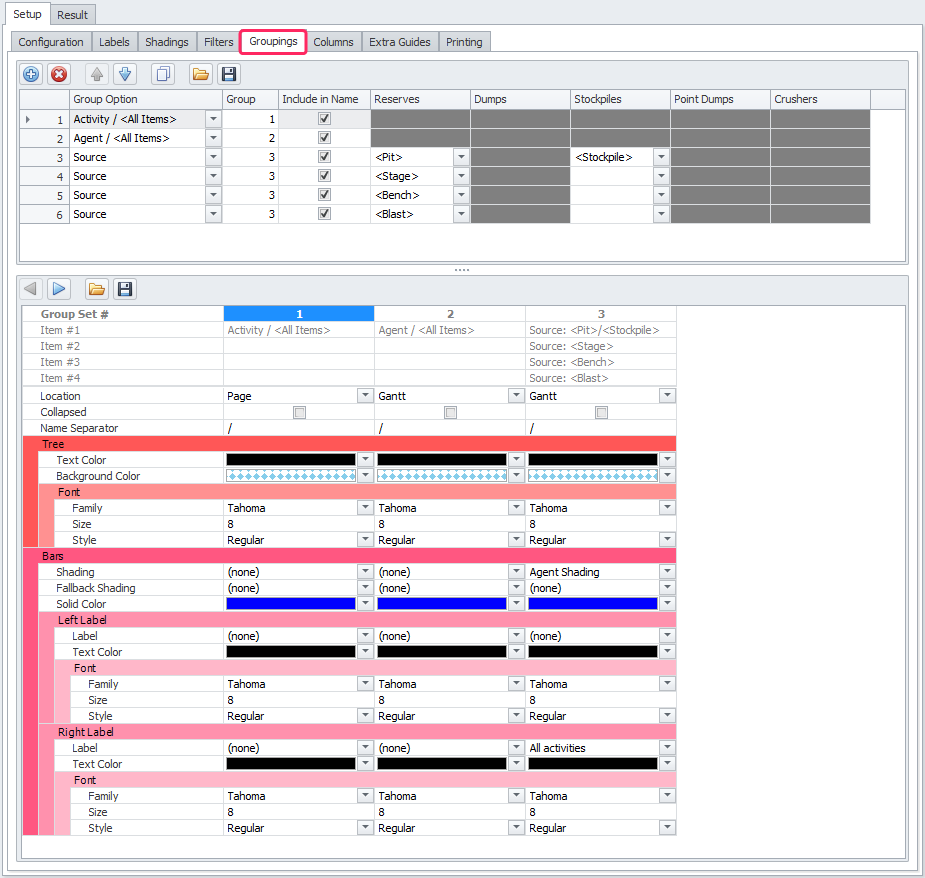 The Groupings tab is a main section to configure how things are displayed on the Gantt. This is really the heart of Gantt report.
