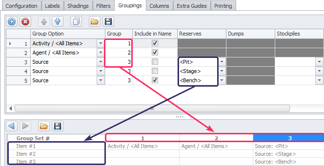 Levels are showing Result tab items from left to right as set in the Groupings tab. In this example, Level 1 is Activity, Level 2 is Agent, Level 3 is Source.