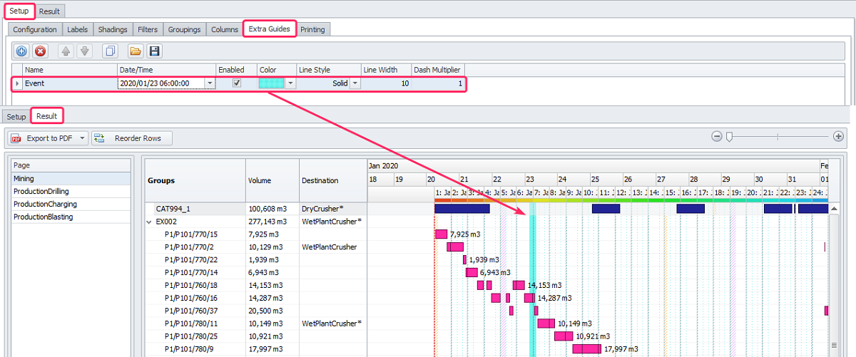 In the Extra Guides tab, you can create extra guides (vertical lines on the Gantt at a specified date) to indicate certain important events.