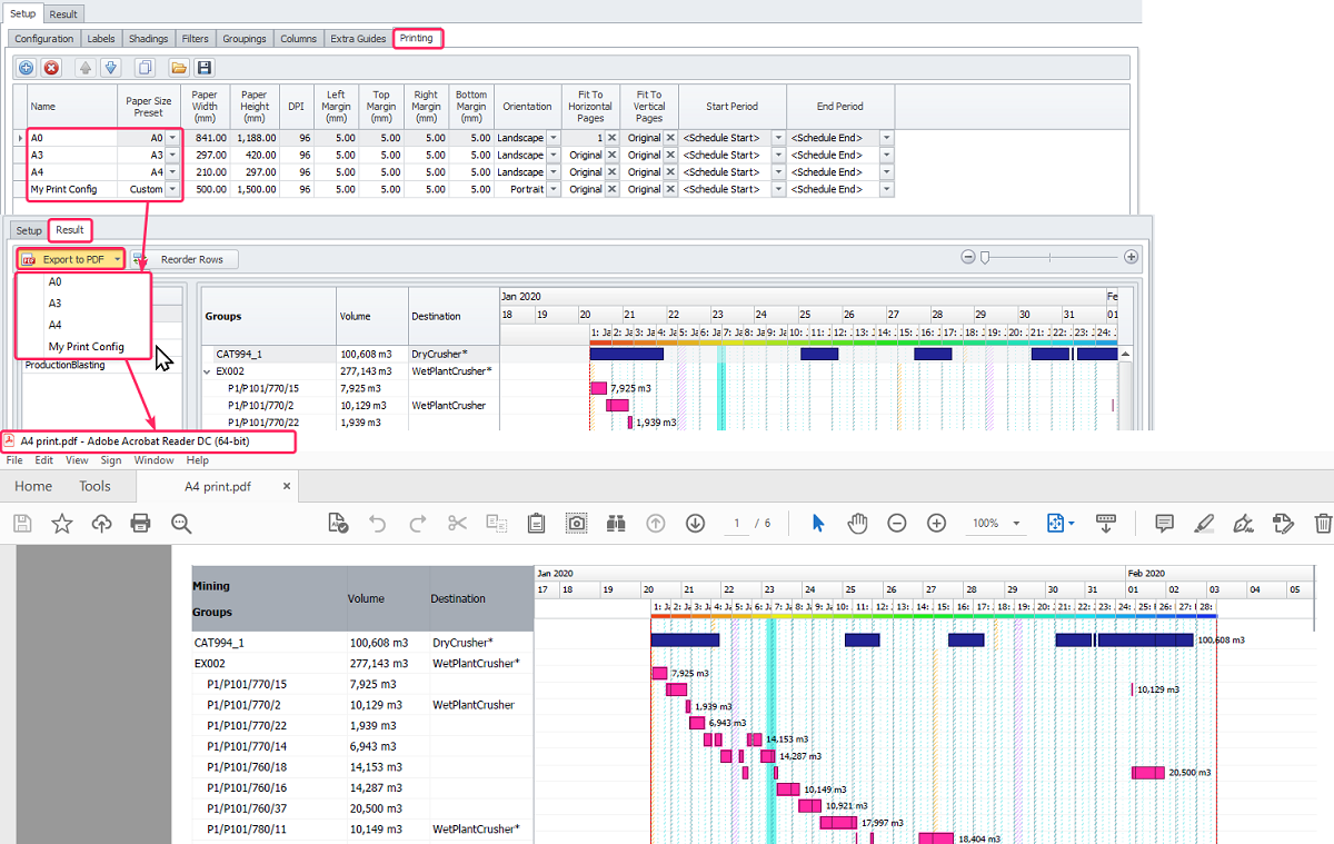 In the Result tab, press Export to PDF button and select one of the printing configurations.